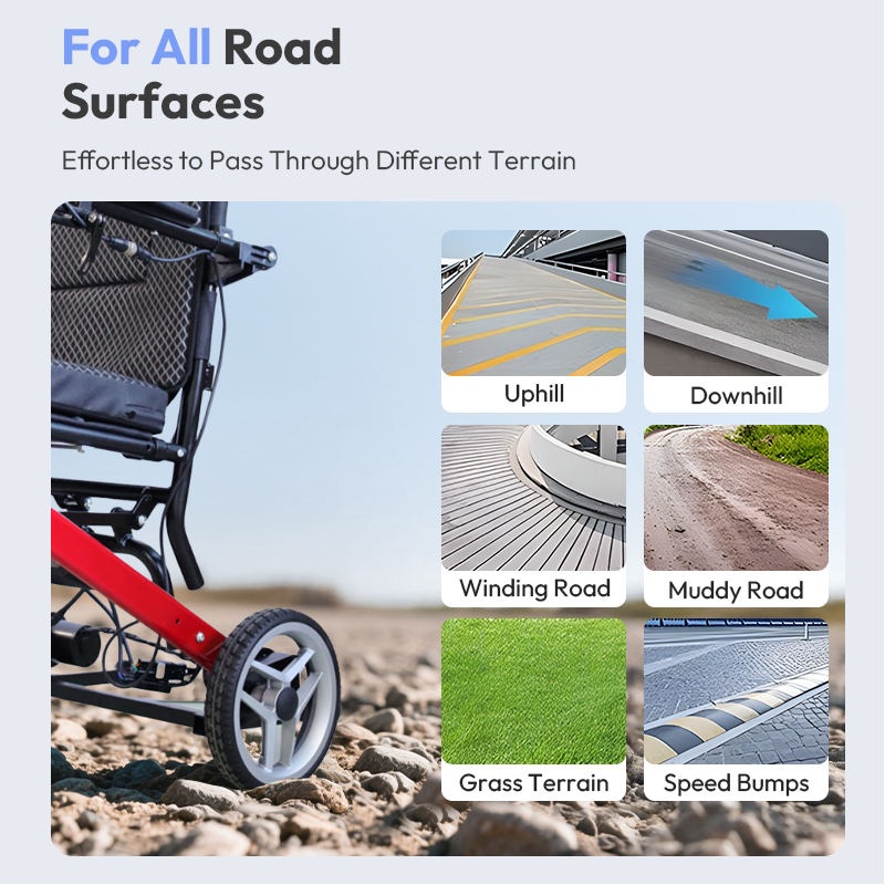 Why does this matter?If you’ve ever tried to use a generic travel scooter on a carpeted hotel lobby or a ramp, you know the struggle. Is this electric wheelchair good for hills? Surprisingly, yes. It handles a ≤ 8° incline with confidence. In the world of accessibility ramps, this chair eats them for breakfast. While I wouldn’t classify it as a mud-bogging machine, it functions effectively as an all-terrain lightweight wheelchair for urban environments, handling paved slopes, grass, and uneven sidewalks better than many competitors.