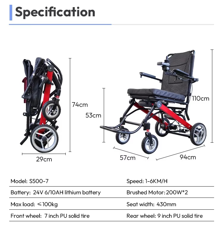 THE ANSWER (Key Specifications Snapshot)The 500-7 sets a new industry standard as a travel friendly power chair. It features a 13.5KG Aluminum Alloy frame and serves as an electric scooter for mobility 15kg total weight when equipped with its 24V 6Ah lithium battery. Despite its featherweight class, this ultra-lightweight power wheelchair lithium model delivers robust performance with Dual 200W Brush Motors, a 100KG load capacity, and a programmable speed range of 1–6 km/h. It is a compact folding electric wheelchair aluminum model designed to fold down to 570 × 290 × 740 mm, making it airline-friendly and perfect for tight storage.