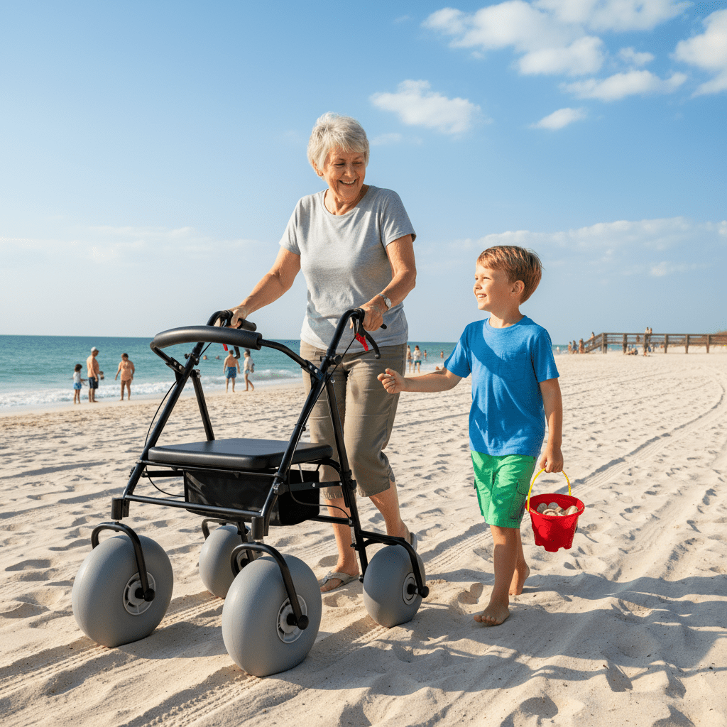 So, what is a beach walker? It’s a specially engineered mobility aid for beach environments, designed from the ground up to conquer the unique challenges of sand, pebbles, and other uneven terrains. Also known as a sand walker or all-terrain walker, this device is the key to unlocking independent beach access. Unlike its indoor counterparts, it’s built for adventure. It’s not just a tool for support; it’s a passport to experiences that were once out of reach. With a beach rollator, the shoreline is no longer a boundary but a destination.