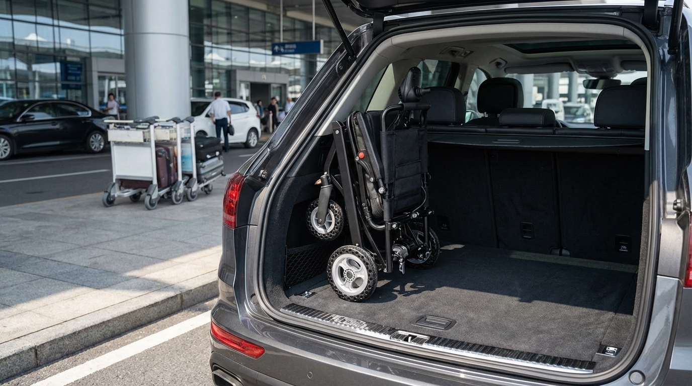 When traveling, the battery terminals should be protected from short circuits by using the original battery box or covering the contacts with electrical tape. If you are using a foldable chair, the battery is often protected within the frame, which is a major advantage for frequent flyers.