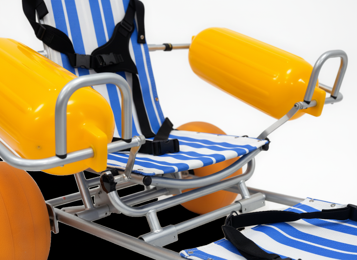 An Ary Floating Beach Wheelchair achieves buoyancy through three oversized orange balloon tires and dual yellow cylindrical pontoons. These components displace enough water to keep the metallic frame and the seated passenger level while drifting in calm surf. The engineering ensures the center of gravity remains low, preventing the chair from tipping during water entry.