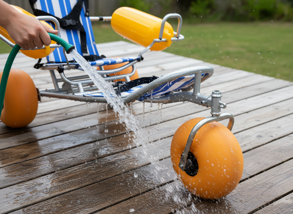 Maintenance for a Floating Beach Wheelchair involves a thorough freshwater rinse after every use to remove salt and sand. Rinsing the connecting plates and silver tubes ensures the quick-release pins continue to operate smoothly without sticking. This simple five-minute process significantly extends the life of the fabric and keeps the orange tires at optimal performance levels.